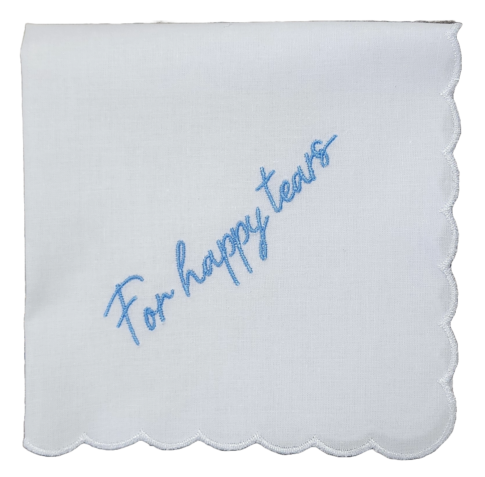 Dab away those joyful moments with our FOR HAPPY TEARS handkerchief—the perfect companion for weddings, engagements, and all the beautiful occasions that make you smile through happy tears. Featuring delicate embroidered details and a charming scalloped edge, this elegant square handkerchief adds a touch of sentiment to your special day. Whether you're the bride, a guest, or part of the wedding party, keep this lovely keepsake close for those precious, tear-filled moments of pure happiness. A timeless accessory that celebrates love in the sweetest way.