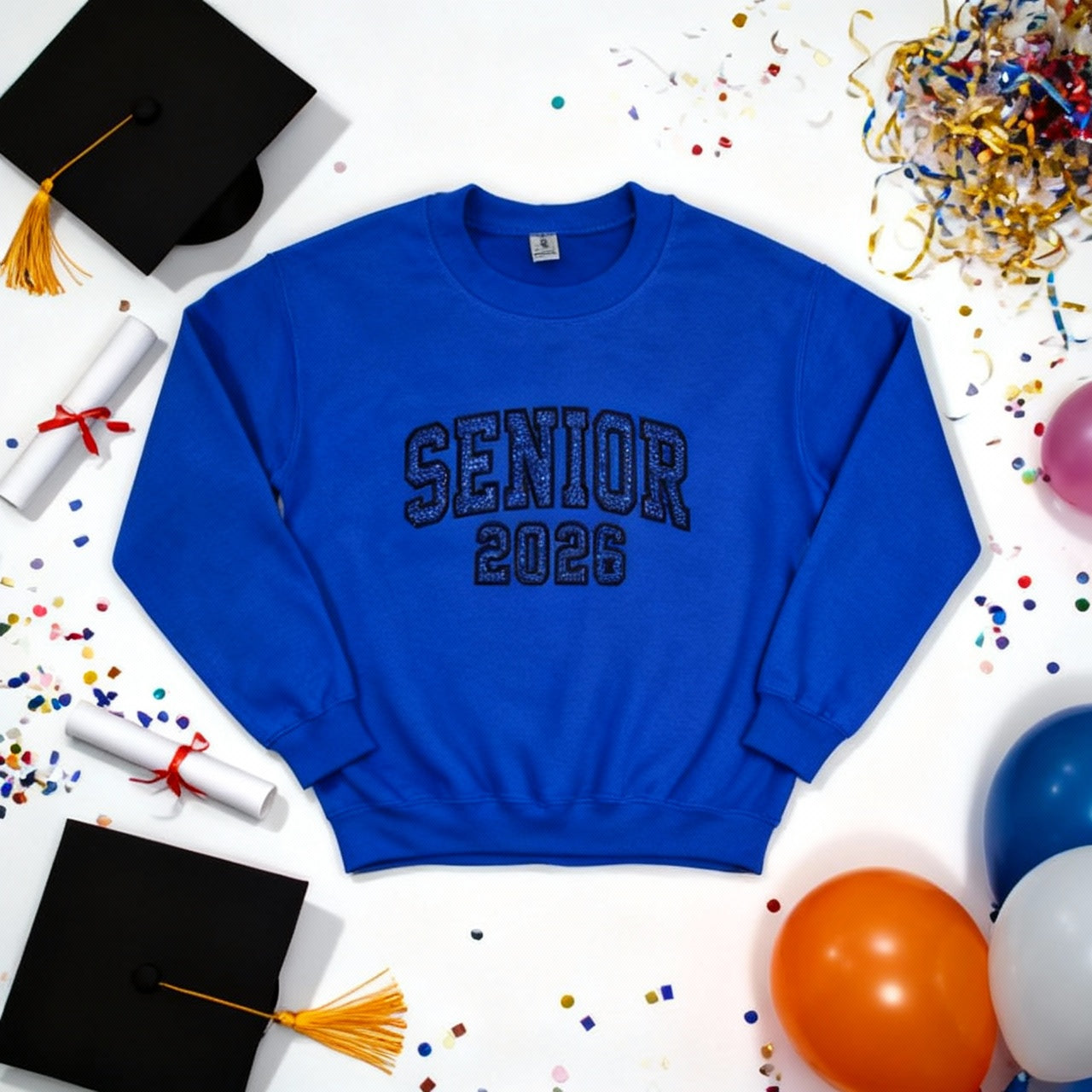 Celebrate the Class of 2026 in style with this eye-catching fleece crew sweatshirt! Featuring bold "SENIOR 2026" embroidery in shimmering glitter HTV appliqué, it's the perfect way to show off graduation pride. This cozy crew is perfect for all of the upcoming senior events, class photos, or everyday wear. Soft, comfortable fleece keeps you warm while the standout design turns heads. Whether you're treating yourself or gifting a fellow grad, this sweatshirt captures the excitement of this milestone moment in unforgettable fashion.